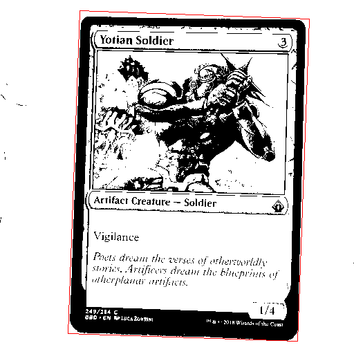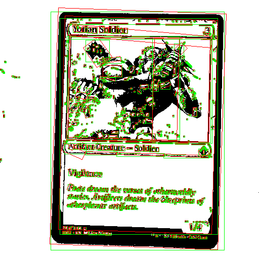 And with some further changes, we can identify and draw only the largest element that isn’t within a certain percentage of the total image size, which should be the card.