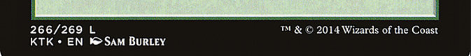 In the case of this example, the card number is 266/269 (or just 266), the set code is KTK (Khans of Tarkir), the language code is EN (English), and the rarity is L (basic land).