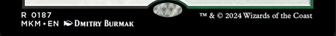 In the case of this example, the card number is 0187, the set code is MKM (Murder at Karlov Manor), the language code is EN (English), and the rarity is R (rare). You can also see the holofoil stamp that is present on M15 frame rare and mythic rare cards.